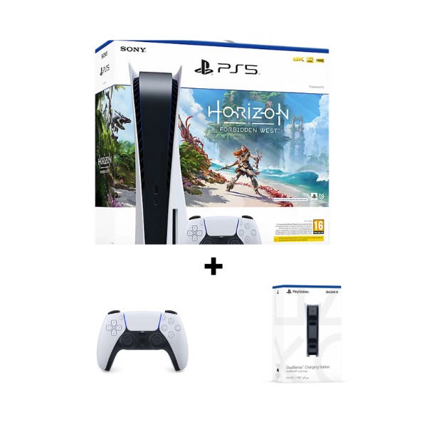 Bundle PS5 Standard Edition avec le jeu Horizon Forbidden West (code de téléchargement) + Manette Dualsense + Station de charge.